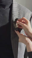 The Charles Lapel Pin is a modern and eclectic accessory, featuring a striking black flower, a white mother-of-pearl leaf, and subtle touches of black mother-of-pearl.