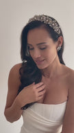 Inspired by the essence of the first woman, the Eve crown embodies both femininity and resilience. Adorned with a stunning array of clear, ivory cream, golden shadow, and blue-shade crystals, complemented by cream mother-of-pearl and ivory pearls, this crown is a celebration of timeless beauty and strength. Perfect for brides who want to radiate elegance and empowerment on their special day.