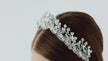 The Jane wedding crown combines clear and white opal ultra-precise, man-made crystals with mother of pearl flowers and navettes, as well as pearl chains.