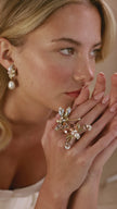 The Libélula Ring captures the ethereal beauty and movement of a dragonfly in flight. Handcrafted with marquis, pear, and raindrop golden shadow crystals; round white opal crystals; mother-of-pearl navettes; raindrop slate blue crystals; round blush crystals; light blush drop crystals; and pear blush crystals, this piece radiates a soft, luminous harmony of tones. A symbol of transformation and lightness, Libélula embodies the poetic essence of the Tú y Yo collection, where nature meets artistry in motion.