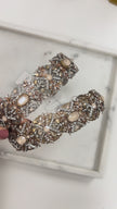 Our Profound headband is here to celebrate with us the deeply significant bonds we form throughout our lives. This luxurious and impactful headband is adorned on a gold base with rose gold leaves, round and marquise shaped clear crystals, marquise shaped golden shadow crystals, round and oval shaped ivory cream crystals.
