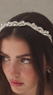 Our dreamlike Reverie crown evokes a sense of romanticism and will allow our brides to get lost in the enchantment of their wedding day. It is adorned with clear and white opal crystals and small mother-of-pearl flowers.